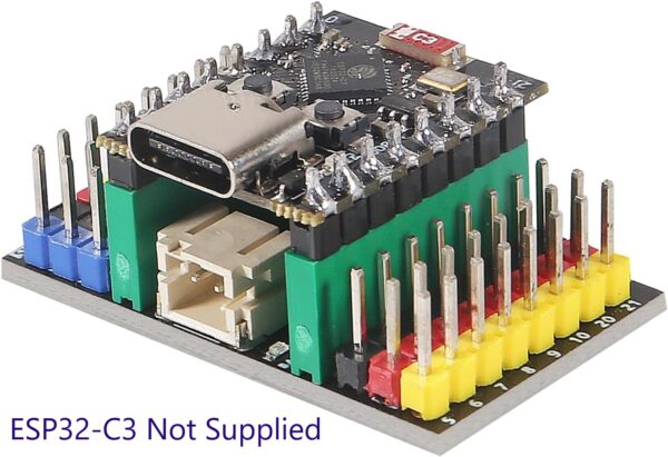 Designed specifically for the ESP32-C3 SuperMini, this expansion board provides breakout pins for each pin on the SuperMini, multiple colour-coded Ground, 3.3V and 5V breakout pins.