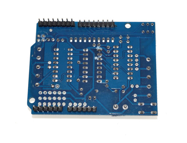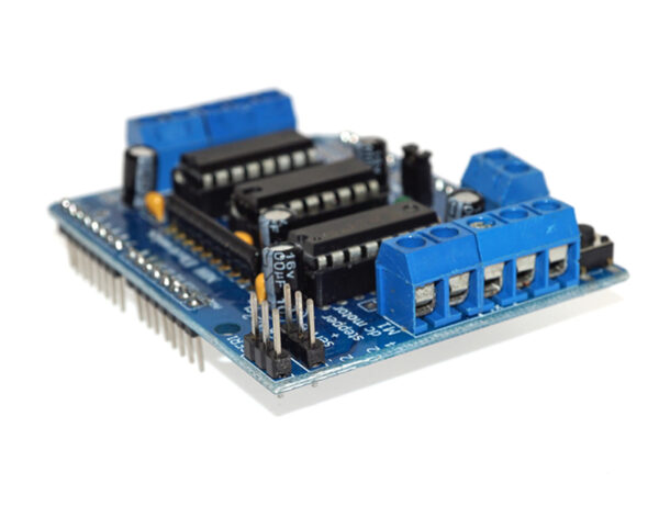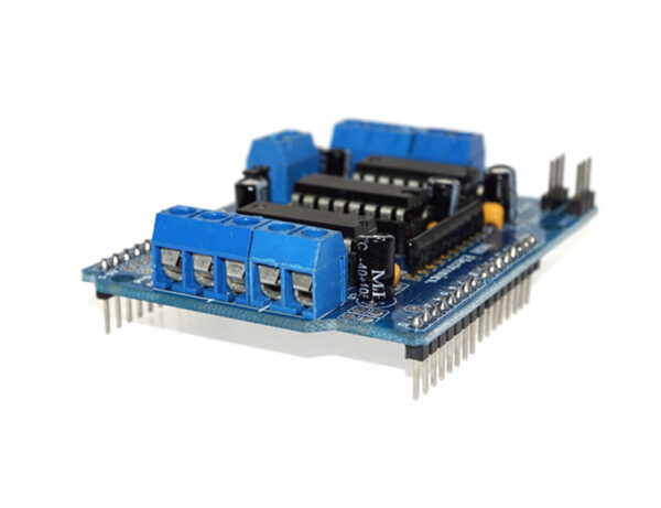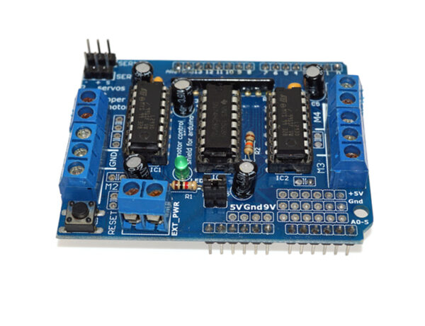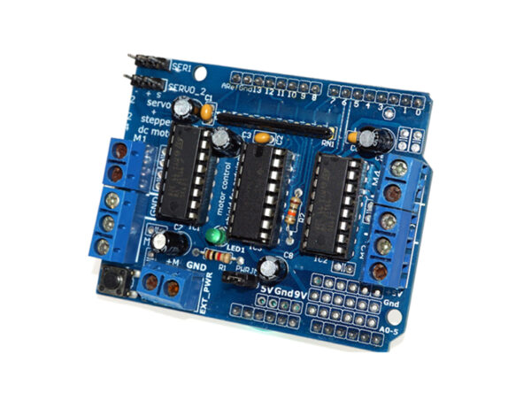 - Can drive 4 DC motors or 2 stepper motors or 2 Servo